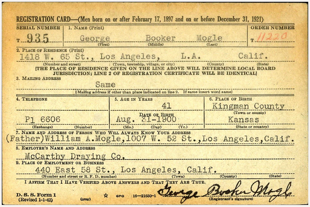 In Los Angeles, Mogle continued to work as an auto mechanic, and married Ida Viola Duncan, a native of Colorado, on May 29, 1922. The Mogles had two children -- George Ervin Mogle, born June 6, 1923, and Ida Luella Mogle, born Jan. 22, 1925. The family lived at 1418 W. 65th St.