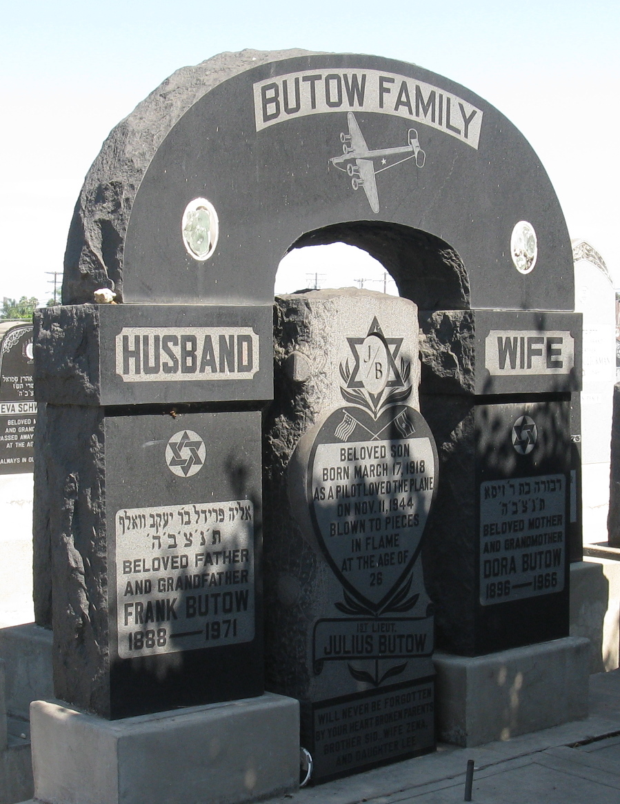 The graves at Mount Zion include 1st Lt. Julius Butow, an Air Force pilot who was shot down during World War II ("blown to pieces in flame at the age of 26," according to his ornate grave marker), and his parents, Russian immigrants Frank and Dora Butow; Yiddish-American writer Lamed Shapiro; and two of the young victims of the