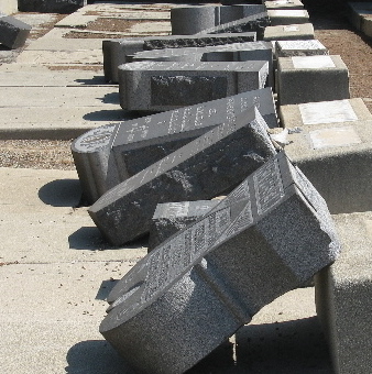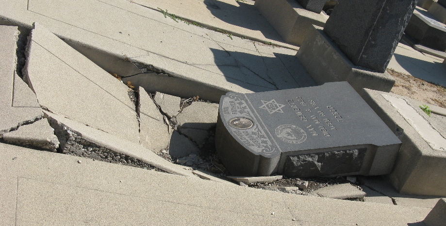 Even worse than the earthquake damage, Mount Zion has also been targeted by vandals, who have pushed over more than 300 huge grave markers, scrawled graffifi, and smashed enamel portraits on grave markers. Many of the fallen grave markers have crushed and broken the concrete ledgers over the graves. Some of the ledgers can be repaired, but many need to be replaced.