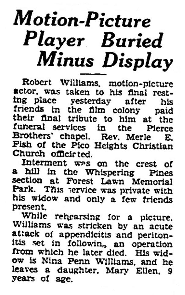 Funeral services were held at the Pierce Brothers Funeral Chapel, 720 West Washington Blvd., Los Angeles. Williams was buried at Forest Lawn Memorial-Park in Glendale.
